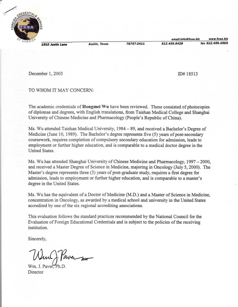 Dr. Wu has the equivalent of a Doctor of Medicine (M.D.) and Masater of Science as awarded by a medical school and university in the United States.