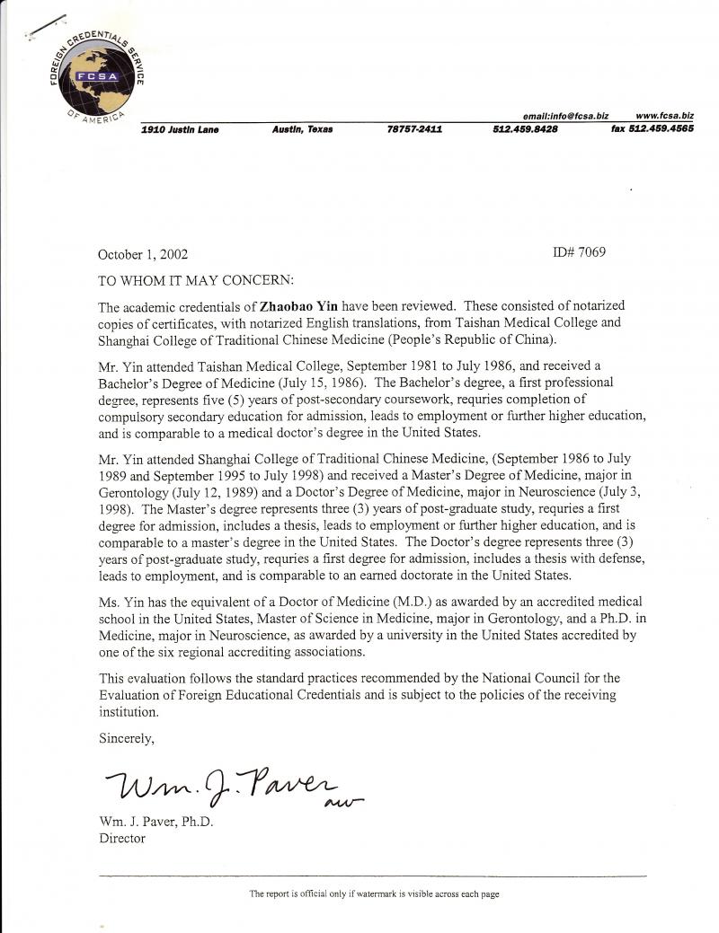 Dr. Yin has the equivalent of a Doctor of Medicine (M.D.) and Ph.D. as awarded by an accredited medical school and university in the United States.